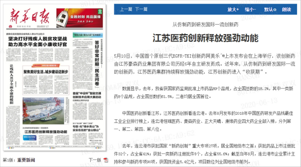 On May 17, Xinhua Daily's report on the front page:"From Generic Drugs to World-Class Innovative Drugs, Pharmaceutical Innovation in Jiangsu Unleashes Strong Momentum"