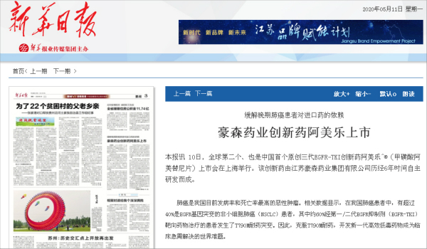 On May 11, Xinhua Daily's report on the third page: "Hansoh Pharma Launches Innovative Drug Ameile to Relieve Dependence of Advanced Lung Cancer Patients on Imported Drugs"