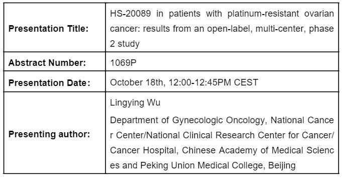 ESMO 2025 | HANSOH PHARMA PRESENTS THE PHASE 2 STUDY FINDINGS OF HS-20089 (B7-H4-TARGETED ADC), IN PATIENTS WITH PLATINUM-RESISTANT OVARIAN CANCER (PROC)