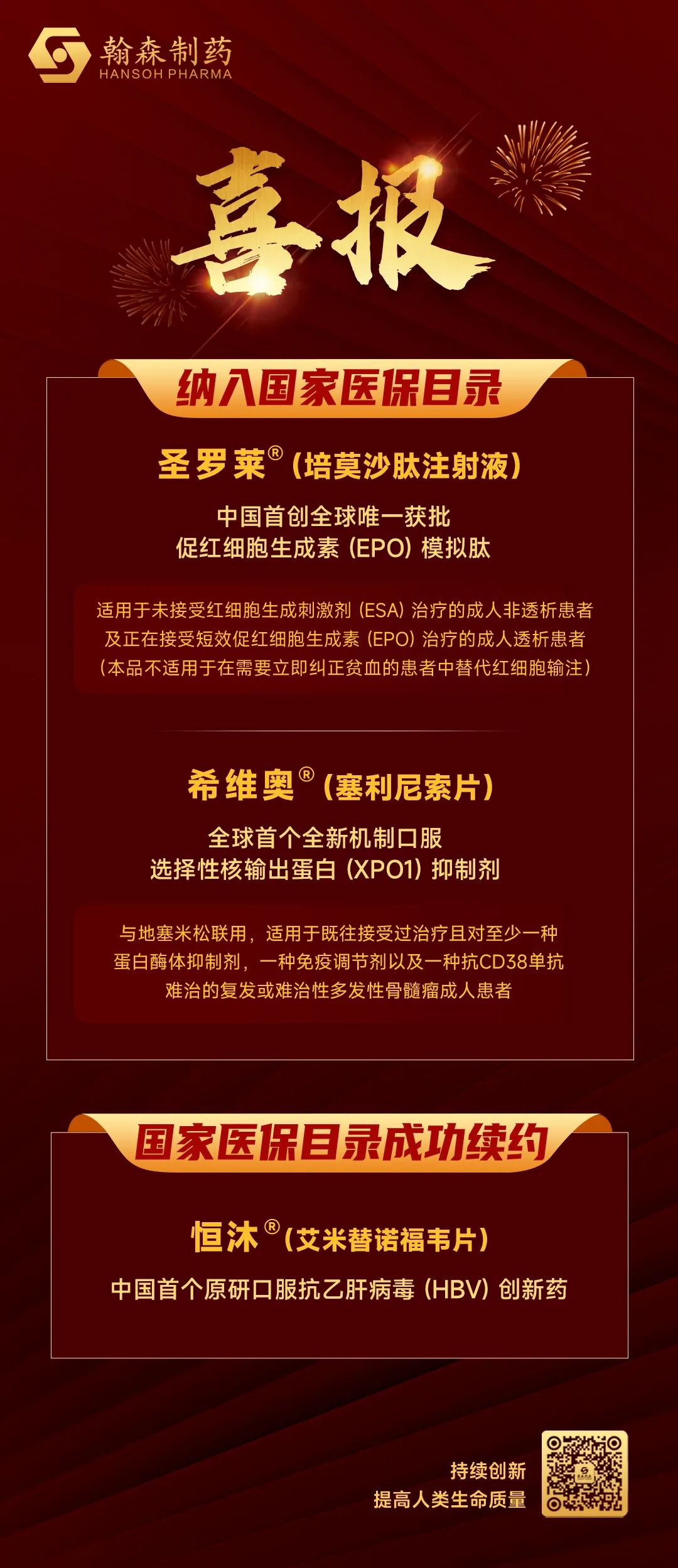 12月13日,国家医保局与人力资源社会保障部公布《国家基本医疗保险、工伤保险和生育保险药品目录(2023年)》(以下简称“国家医保目录”),皇冠体育博彩自主研发的1类创新药圣罗莱®(培莫沙肽注射液)两项适应症成功纳入医保,另一款创新药恒沐®(艾米替诺福韦片)也成功续约。新版国家医保目录将于2024年1月1日起正式实施。至此,皇冠体育博彩已上市的7款创新药全部纳入国家医保目录。