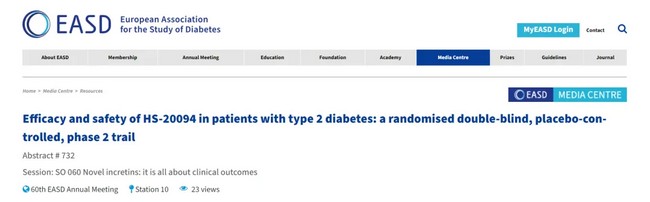 第60届欧洲糖尿病研究协会(EASD)年会于2024年9月9-13日在西班牙马德里举行。皇冠体育博彩HS-20094(GLP-1R/GIPR双靶点激动剂)Ⅱ期临床研究数据以口头报告的形式在大会发布。