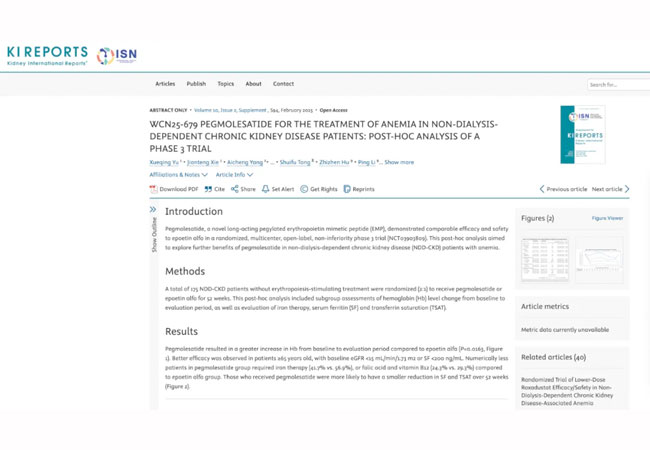 2.Xueqing Yu,et al. Pegmolesatide for the Treatment of Anemia in Non-dialysis-dependent Chronic Kidney Disease Patients: Post-hoc Analysis of a Phase 3 Trial. WCN 2025. Abstract No: WCN25-679.