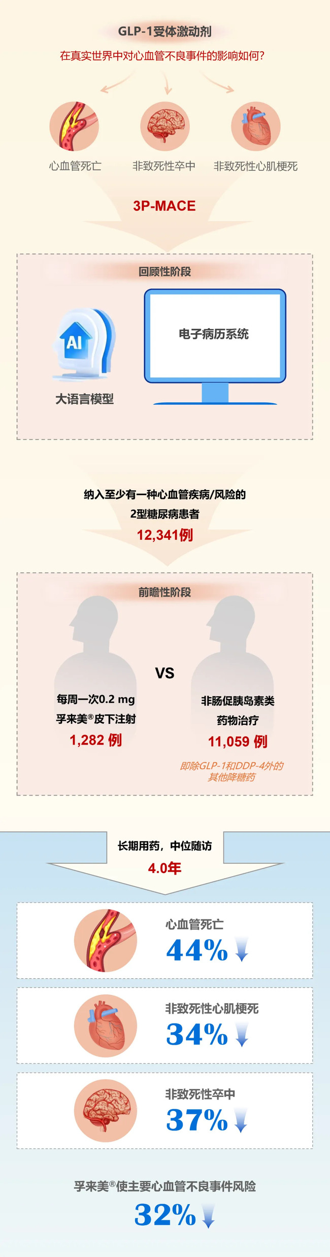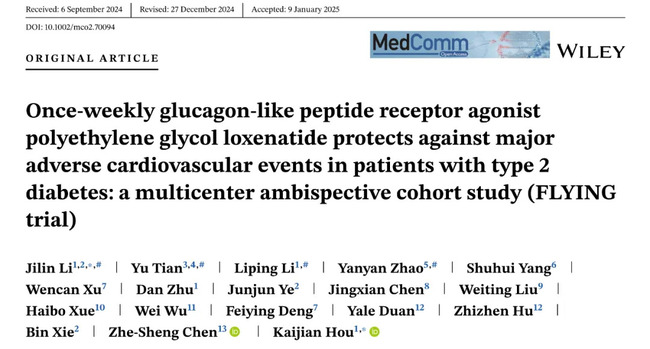 近日,皇冠体育长效胰高血糖素样肽-1受体激动剂(GLP-1RA)孚来美®(聚乙二醇洛塞那肽注射液)大型多中心双向队列研究(FLYING研究)结果发表于国际著名医学期刊MedComm(IF:10.7)[1]。该研究证实长期使用孚来美®的2型糖尿病患者,其主要心血管不良事件(MACE)风险显著下降32%。