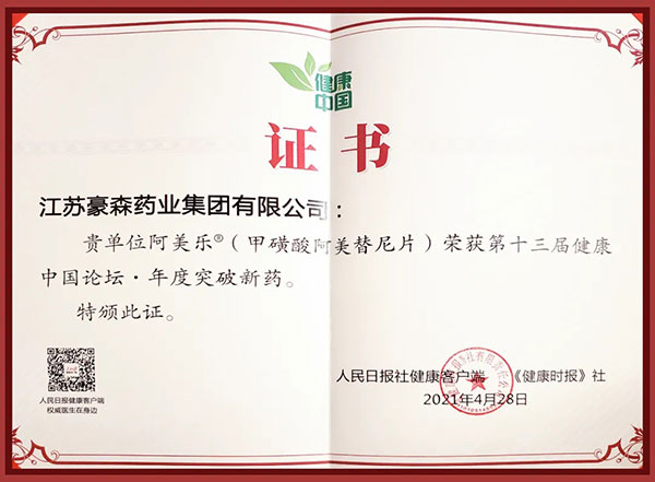 4月28日,人民日报社健康客户端和《健康时报》社颁布了“第十三届健康中国论坛·年度突破新药”等系列榜单荣誉。皇冠体育(以下简称“皇冠体育”)自主研发的首个中国原创三代EGFR-TKI创新药阿美乐®(甲磺酸阿美替尼片)荣膺上榜。