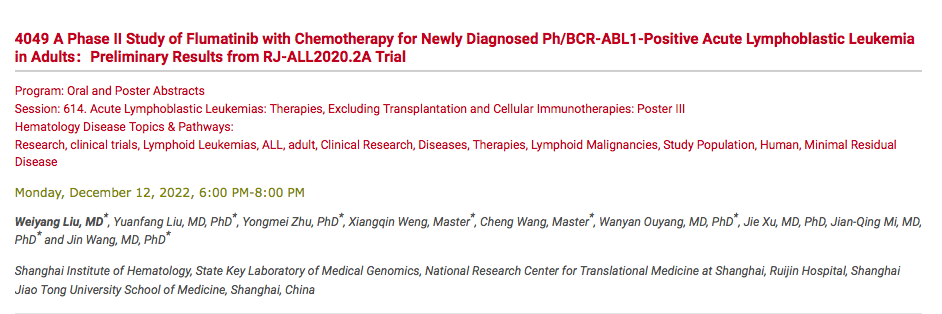 氟马替尼联合化疗治疗新诊断的Ph/BCR-ABL1阳性成人急性淋巴细胞白血病的II期研究:RJ-ALL2020.2A试验的初步结果