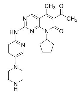 | 【成份】 | 本品主要成份为哌柏西利。 化学名称:6-乙酰基-8-环戊基-5-甲基-2-{[5-(1-哌嗪基)-2-吡啶基]-氨基}-吡啶并[2,3-d]嘧 啶-7(8H)-酮 化学结构式: